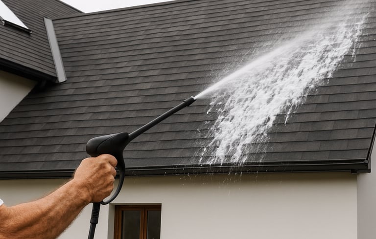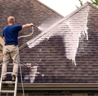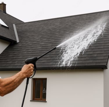 Our soft wash process is designed to safely clean and restore your roof. We begin by applying a gentle yet highly effective cleaning solution that soaks into the shingles, breaking down algae and organic material at the source. The solution is allowed to sit for 10–20 minutes so it can fully penetrate and do its job. Once the treatment has taken effect, we rinse with low pressure (typically 150–400 PSI) using a specialized pump and nozzle. This rinsing method washes away debris while protecting your roof from the damage that high-pressure washing can cause.